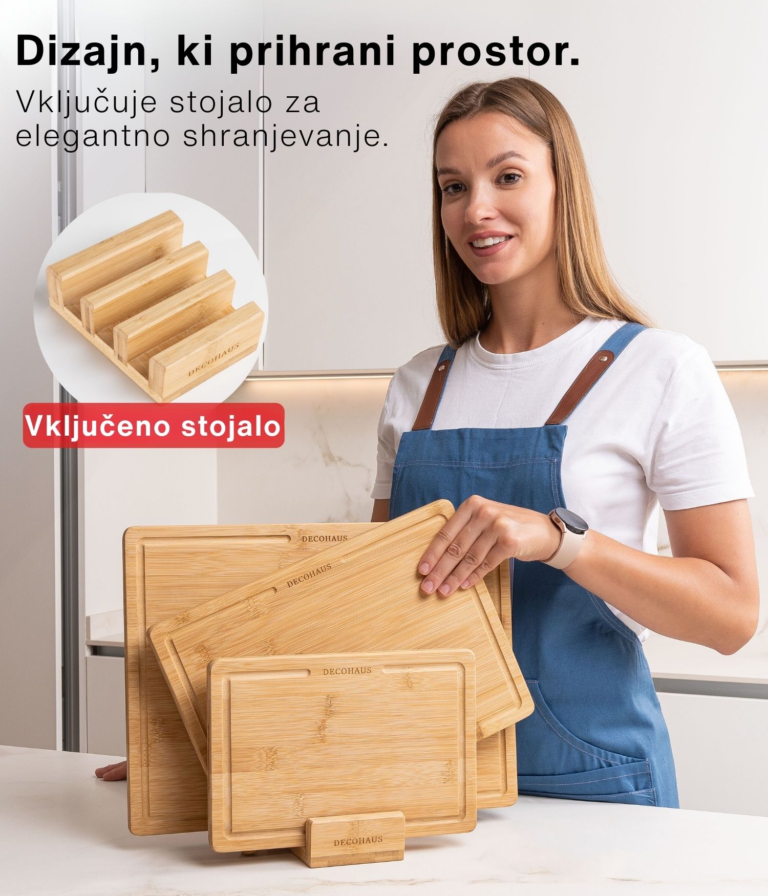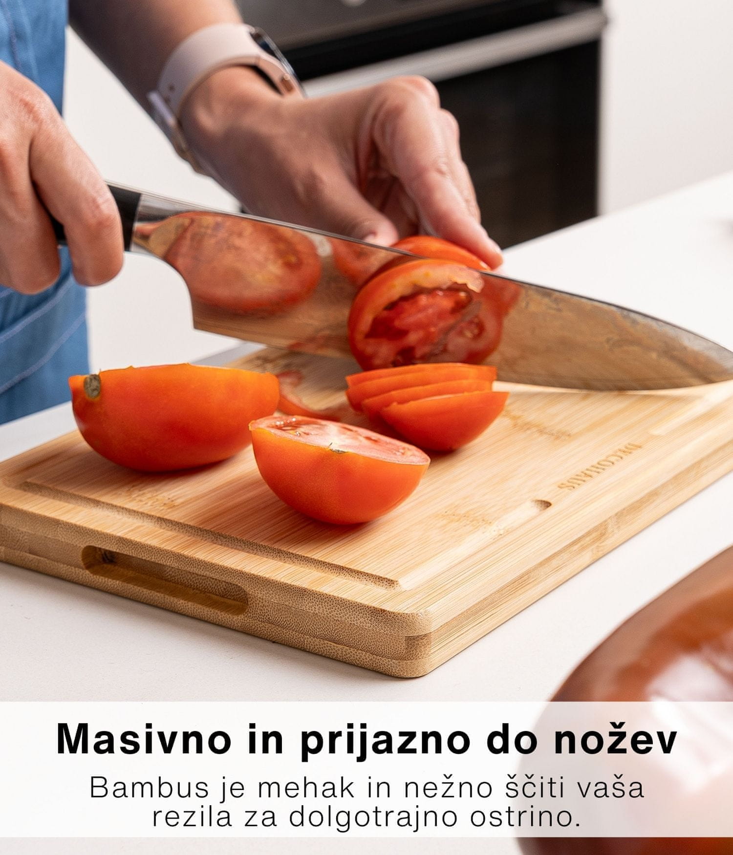 - Komplet bambusovih rezalnih desk – visokokakovosten, antibakterijski bambus zagotavlja, da so naše rezalne deske trajne, nežne do nožev in stilsko privlačne v vsaki kuhinji.