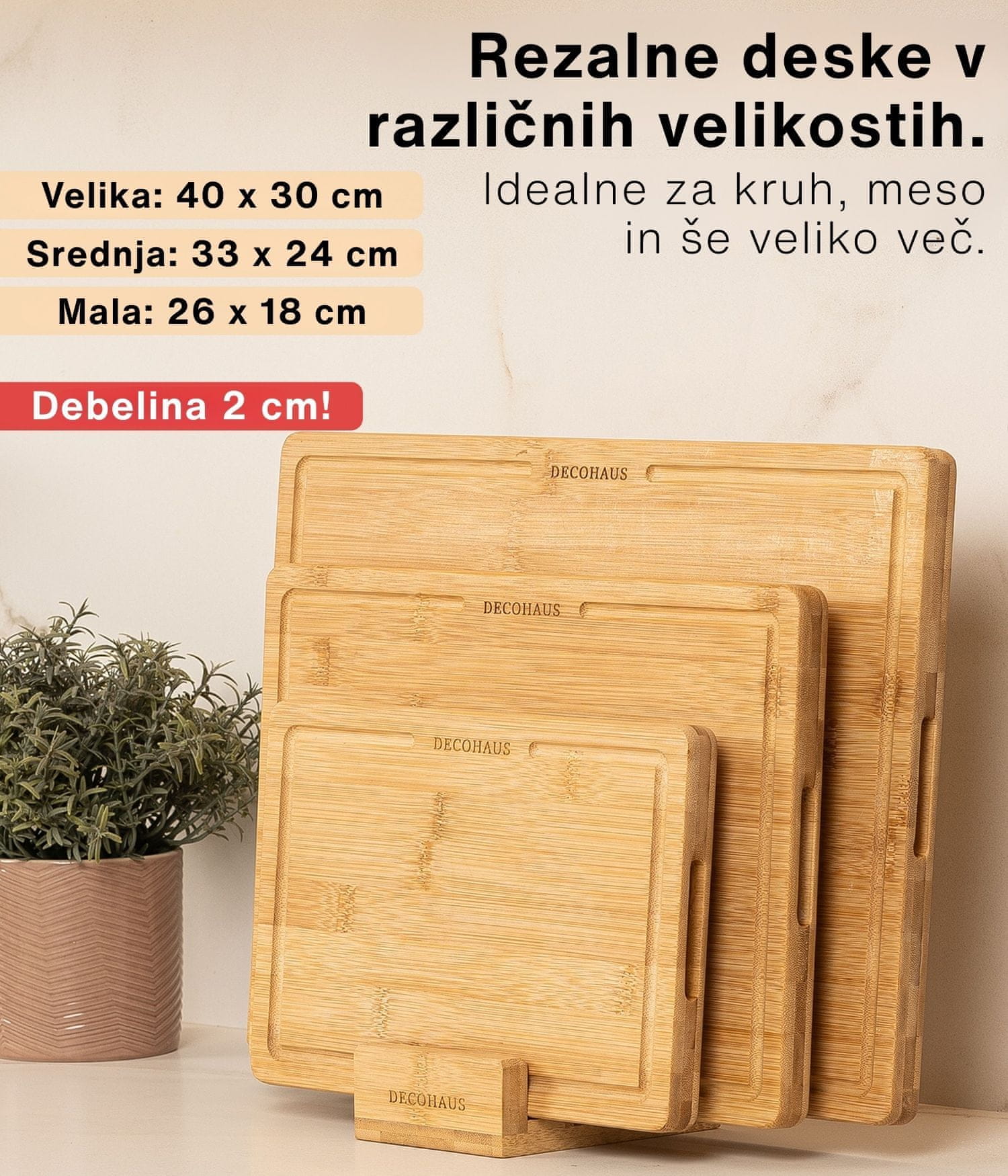 Deco Haus Set 3 lesenih desk za rezanje iz robustnega bambusa [2 cm DEBELINE] - Deske za rezanje z žlebom za sok - Lesene deske za kuhinjo 40x30, 33x24, 26x18 - Lesena deska za rezanje