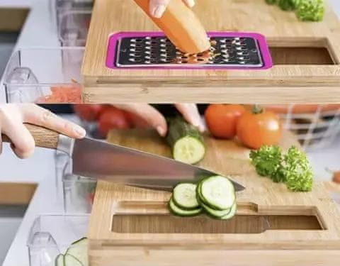 4 strgala - deska ima posebno vdolbino za strgalo omogoča enostavno in hitro ribanje različnih sestavin direktno na desko, vse pade direktno v koš. V kompletu so 4 strgala različnih debelin za različne namene.