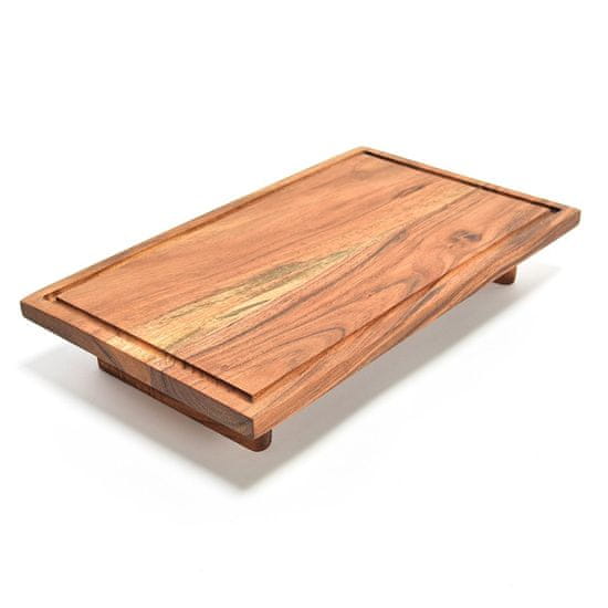 Deska za rezanje na podstavkom Natur dimenzije 42×25×7 cm je idealna za rezanje in serviranje suhih mesnin, sirov, mesa, kruha in ostalih pekovskih izdelkov. Izdelana je iz temnega lesa, ki se bo lepo podal na vsak kuhinjski pult ali mizo. Na robovih ima kanal za zbiranje odvečne tekočine. Očistite jo z vlažno krpo in blagim detergentom ter dobro posušite.