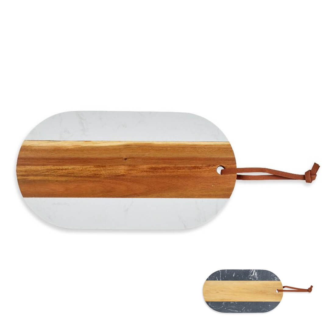 Čudovita rezalna deska združuje eleganco marmorja s toplino naravnega lesa, kar ustvarja prefinjen dodatek za vsako kuhinjo ali jedilnico. Izdelana je iz belega oz. črnega marmorja, ki daje prestižen videz vsakemu kuhinjskemu prostoru. Ovalna oblika deske 33,5 × 18 cm je dovolj prostorna za rezanje in pripravo različnih sestavin, od zelenjave do mesa. Pomijte jo ročno in dobro posušite.