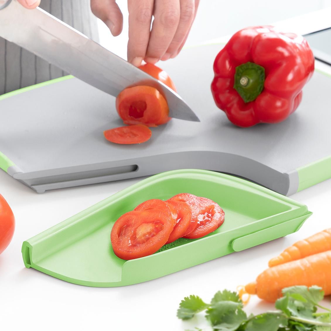 Ena stran te deske za rezanje je opremljena s konicami, ki držijo meso in ribe med rezanjem. Ima tudi odstranljiv del, ki omogoča preprosto dodajanje sestavin v lonec.