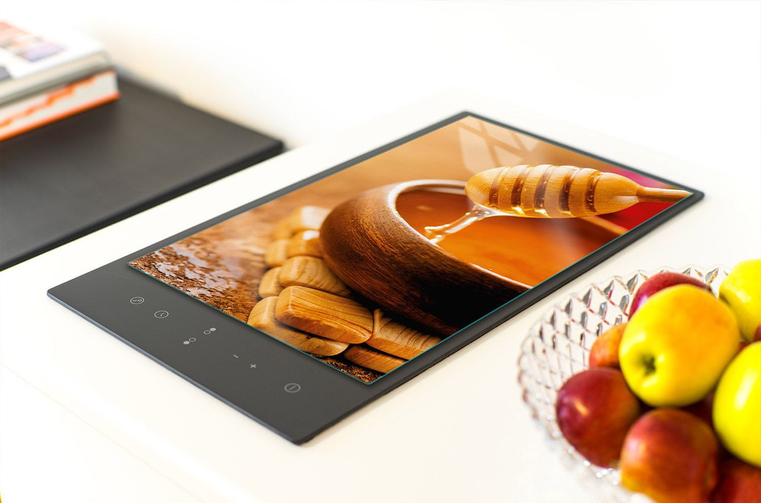 na steklu. Zaradi tega plošča pritegne poglede in postane edinstven okras vaše kuhinje. Tisk je na hrbtni strani stekla, kar dodatno podaljša življenjsko dobo