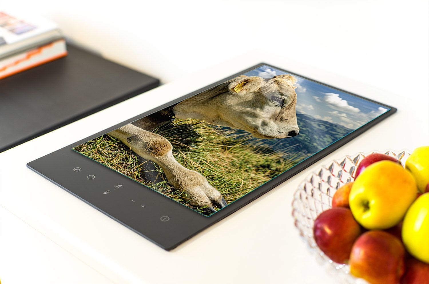 vzdržljivost tudi pri visokih temperaturah. Steklena površina je gladka in odporna na obremenitve z rahlo zaobljenimi vogali. Edinstvena tehnologija UV-tiskanja naredi barve grafike žive in nasičene