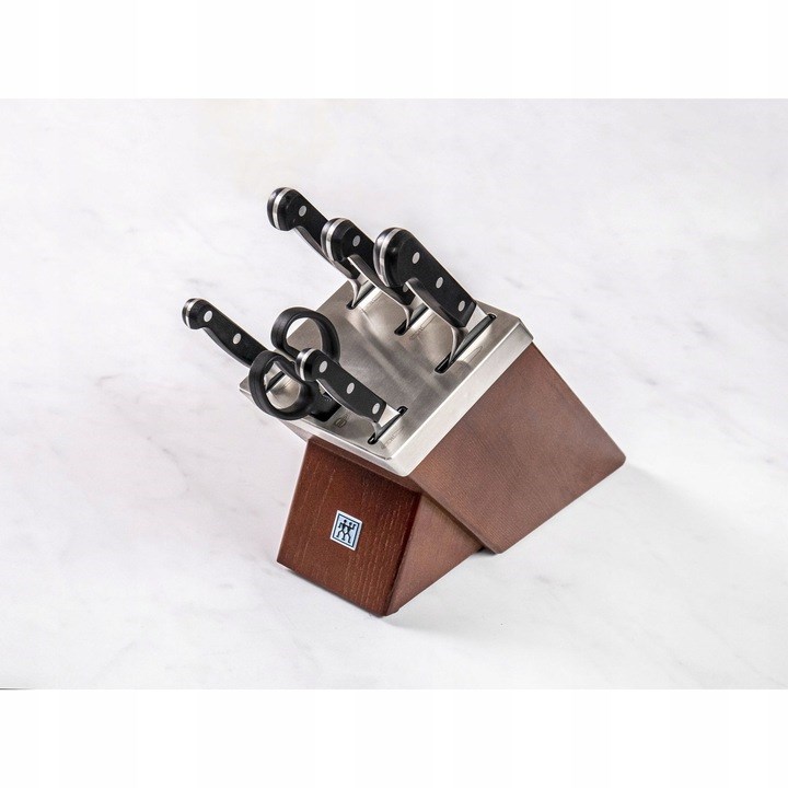 Samoostrilni blok ZWILLING s tehnologijo KIS skrbi za vaše nože in jih nabrusi vsakič, ko jih vstavite in odstranite. Ne glede na to, ali ste profesionalni kuhar ali amater, ki rad posega po kuhinji, sta ostrina in kakovost vaših nožev izjemno pomembni. Preprost, dobro premišljen mehanizem namesti dva keramična brusna kamna pod optimalnim kotom v vsako režo za gladek rob noža. Da bi nože lažje namestili v ustrezne reže, majhen piktogram poleg vsake reže označuje, kaj mora biti v notranjosti. 10-centimetrski nož za sadje in zelenjavo, 13-centimetrski univerzalni nož, 20-centimetrski nož za mesnice, 20-centimetrski kuharski nož, 20-centimetrski nož za kruh in večnamenske kuhinjske škarje imajo vse svoje mesto. Značilnosti bloka so impresivne, prav tako pa tudi njegov videz. Rjavi jesenov les, iz katerega je izdelan, je eleganten in privlačen ter se poda k vsaki kuhinji.
