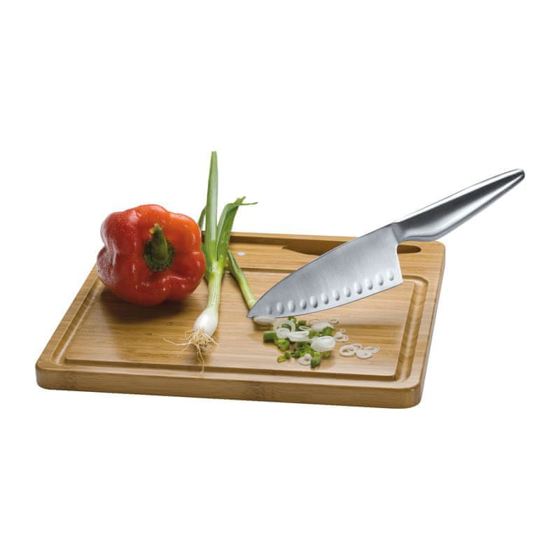 Praktična in elegantna rezalna deska Mantova iz bambusa z vključenim nožem iz nerjavečega jekla. Nož se s pomočjo magneta priročno pritrdi na desko, kar omogoča enostavno shranjevanje in vedno pripravljen pripomoček za rezanje.