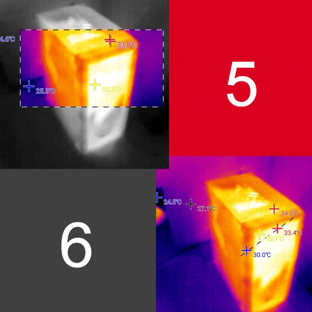 2. Šest načinov termičnega slikanja: železno rdeče, belo vroče, črno vroče, mavrica, rdeče vroče, hladno modro