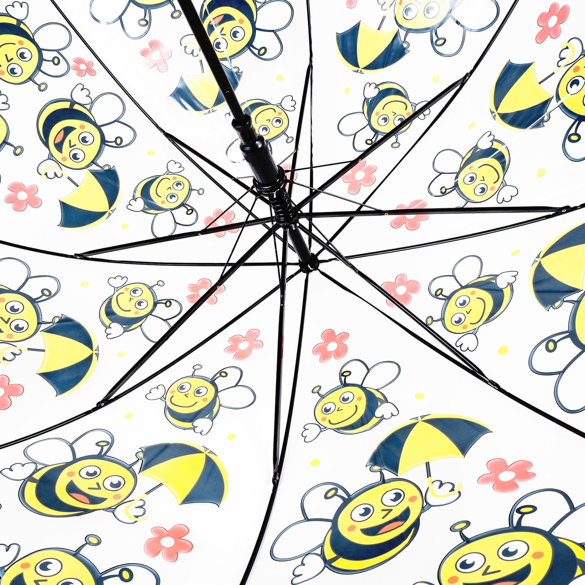 Dežnik je okrašen z veselimi in barvitimi motivi, ki takoj pritegnejo pozornost in pričarajo nasmeh na obraz vsakega otroka.