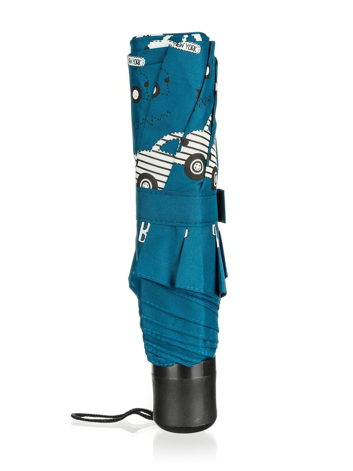 Složljivi dežnik v modri barvi z motivi avtomobilov, ki se uporablja za zaščito pred dežjem in neposrednim soncem. Izdelan je iz vodoodpornega poliestrskega materiala. Slike spremenijo barvo, ko so mokre.