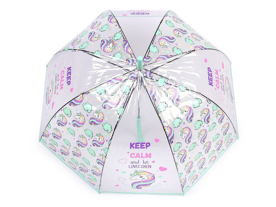 Dekliški dežnik s prikupnim potiskom enorogov je že večje velikosti, primeren za deklice od približno 8. leta starostinaprej .Trdnaprozorna prevleka dežnika s prikupnim potiskom modnih enorogov jih bo dobesedno očarala. Prozorna zasnova omogoča boljši razgled, brez omejujočega zaslona dežnika. Dežnik je izmetni, ima klasično palico, ki jo zaključuje trden ročaj. Konstrukcija dežnika je izdelana iz kovinske žice in je sestavljena iz osmih polj. Žice so zaključene s plastičnimi kroglicami – s tem se zmanjša nevarnost poškodb. Dežnik ima klasično zapenjanje z zaskočnico. Globina dežnika je 33 cm.