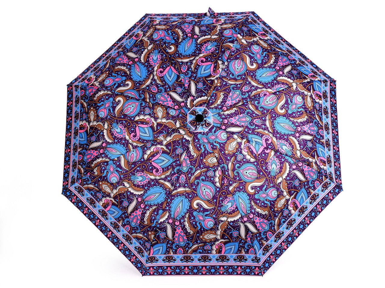 Velik ženski dežnik je zložljiv, popolnoma samodejen Izdelan je iz visokokakovostnega materiala. Prevleko dežnika krasi privlačen motiv paisleyja. Dežnik ima mehanizem za izmetavanje/izstreljevanje. Odpira in zapira se s pritiskom na gumb s puščico navzgor ali navzdol. Ročaj dežnika je plastičen, z zanko. Konstrukcija dežnika je sestavljena iz osmih polj. Dežnik vključuje zaščitni pokrov. Globina dežnika je 21 cm. Skupna dolžina dežnika je 56 cm. Dolžina zloženega dežnika je 30 cm.