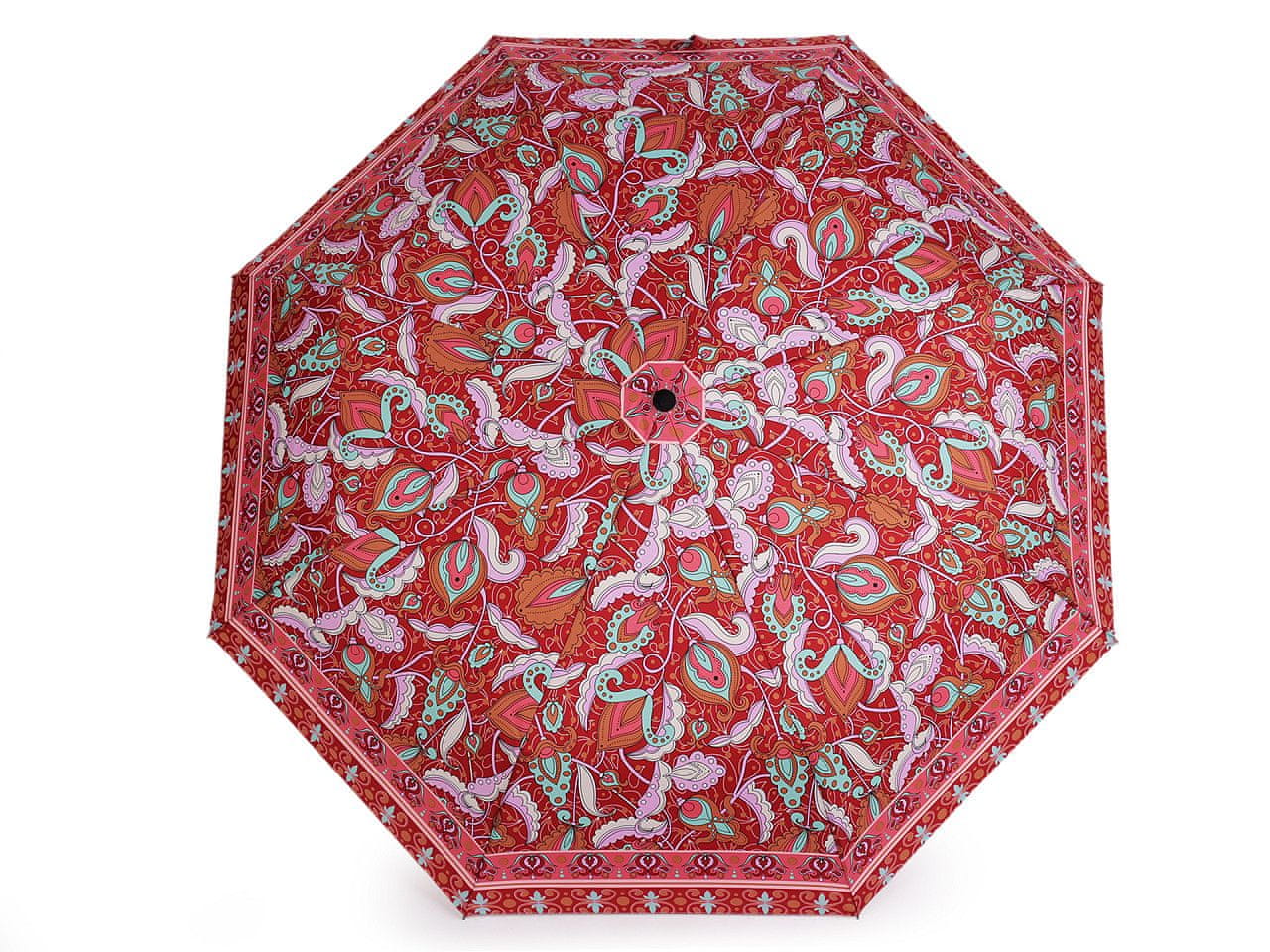 Velik ženski dežnik je zložljiv, popolnoma samodejen Izdelan je iz visokokakovostnega materiala. Prevleko dežnika krasi privlačen motiv paisleyja. Dežnik ima mehanizem za izmetavanje/izstreljevanje. Odpira in zapira se s pritiskom na gumb s puščico navzgor ali navzdol. Ročaj dežnika je plastičen, z zanko. Konstrukcija dežnika je sestavljena iz osmih polj. Dežnik vključuje zaščitni pokrov. Globina dežnika je 21 cm. Skupna dolžina dežnika je 56 cm. Dolžina zloženega dežnika je 30 cm.