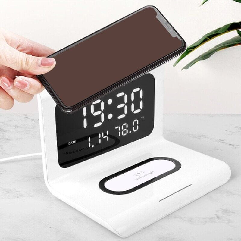 Digipick Večnamenska LED postaja, brezžična polnilna postaja za pametne telefone, sobni termometer, budilka in koledar