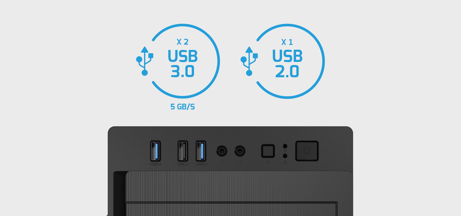 Ohišje je na sprednji strani opremljeno z dvema vhodoma USB 3.0 (do 5 Gb/s), kar omogoča bliskovito hitro priključitev perifernih naprav in hiter prenos velikih datotek. Ta rešitev zagotavlja priročno delo in vam prihrani dragoceni čas. Poleg tega – če vam čas ni pomemben, ampak morate le hitro priključiti napravo – Na ohišju boste našli 2.0 priključek za popolno udobje.