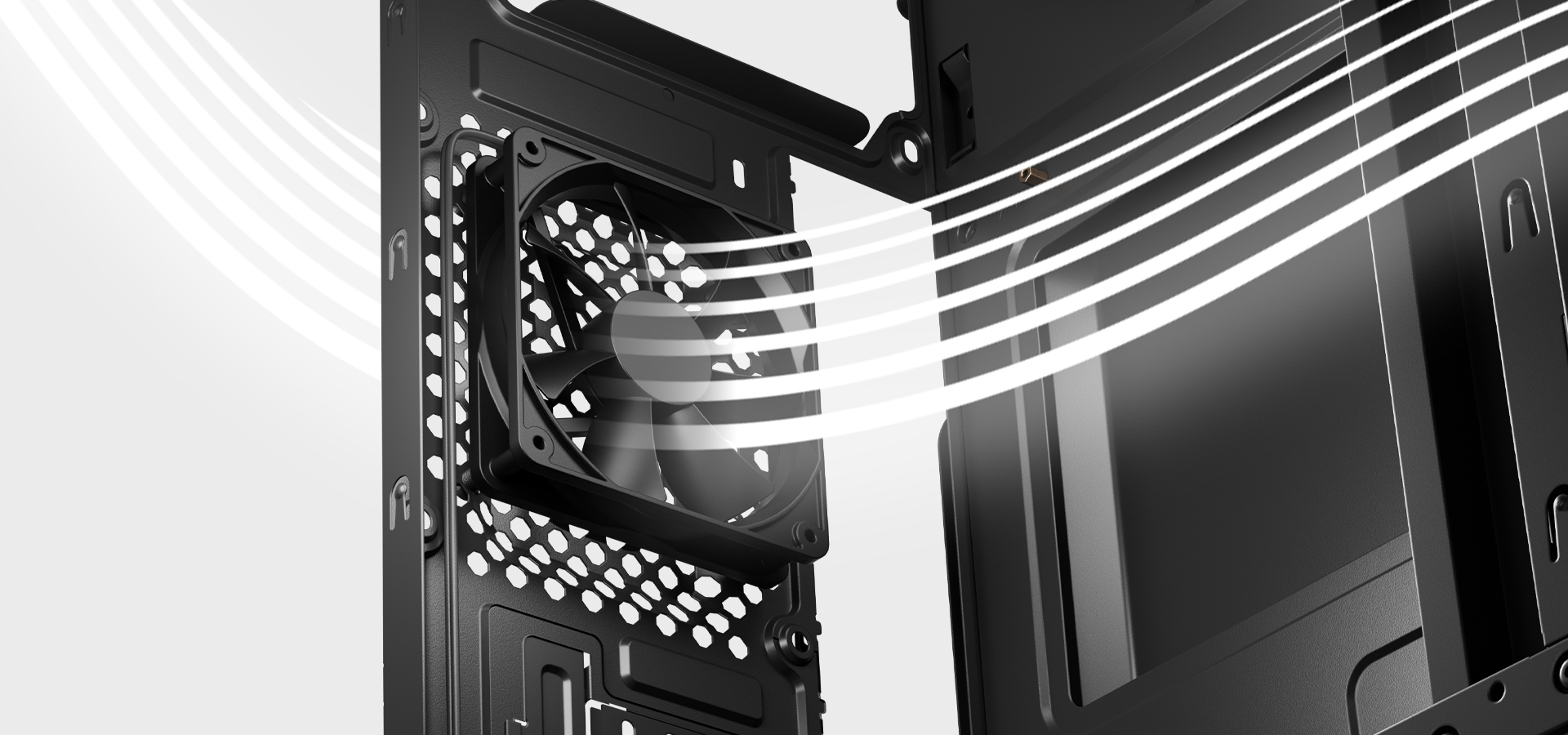 - Predhodno nameščen 80 mm 3-pinski izpušni ventilator na zadnji strani ohišja.