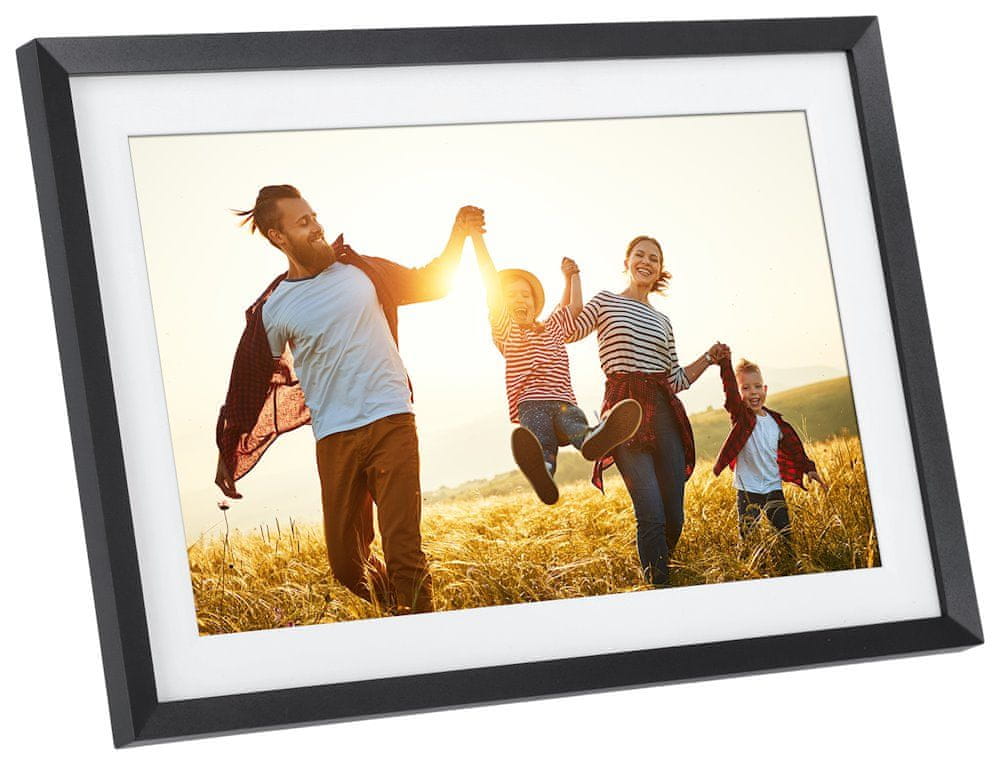 Digitalni okvir Wi-Fi-Fi za predstavitev fotografij in kratkih videoposnetkov (največ 15 s), ki temelji na operacijskem sistemu Android 6.0. Ima 10,1-palčni zaslon IPS na dotik z ločljivostjo 1280 × 800 pik, 2W zvočnike in 8 GB notranjega pomnilnika, v katerega lahko shranite do 7000 fotografij ali 250 videoposnetkov. Te lahko v okvir naložite prek mobilne aplikacije Frameo ali klasično prek pomnilniške kartice microSD ali zunanjega pomnilnika s priključkom USB-C. Poleg tega je na voljo veliko različnih funkcij, kot so zrcaljenje v izklopljenem stanju, samodejno ali ročno vrtenje, nastavitev okvirja, podnapisi, skrivanje ali način spanja. Uživali boste tudi v prikazu ure, vremena in barvni osvetlitvi ozadja za ustvarjanje edinstvenega vzdušja. Bele obrobe okoli zaslona dajejo fotoramčku izviren slog in ga naredijo še bolj podobnega klasičnim fotoramčkom. Zaradi odstranljivega stojala ga lahko postavite na mizo ali obesite na steno.