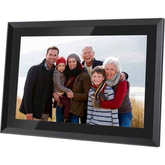 Digitalni foto okvir WiFi 10.1" (25,6 cm) zaslon IPS na dotik Visoka ločljivost 1280 × 800 slikovnih pik Širok vidni kot, svetle barve Povezljivost: Wi-Fi, MicroSD (SDHC/SDXC) 4,6 GB notranjega pomnilnika Aplikacija iOS & Android za pametne telefone brezplačno (FRAMEO) Pošljite fotografije in kratke videoposnetke v foto okvir neposredno s pametnega telefona V nekaj sekundah si oglejte fotografije in videoposnetke prijateljev/družine z vsega sveta Jezikovna podpora, vključno z angleščino Varnostno kopiranje fotografij na kartico micro SD Prikaz napisov Nastavljiv čas samodejnega izklopa Nastavljiv interval diaprojekcije Nastavljiva svetlost Navpično/vodoravno stojalo Možnost namestitve na steno 1 W zvočnik Napajalnik 100–240 V 50/60 HZ, 0,3 A ; = 5V/2A Dimensions: 266×186×20 mm (ŠxVxG) Teža: 0,52 kg