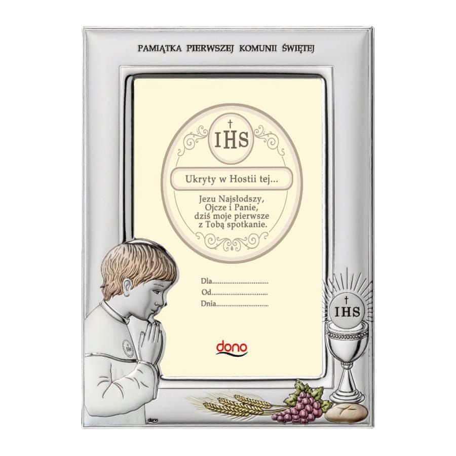 Ta ekskluzivni spominek v obliki okvirja za fotografije je ustvaril , vodilni v proizvodnji srebrnih spominkov. Okvir prikazujefant prejel prvo sveto obhajilo. Barvni elementi dodajo kontrast in poudarijo razred izdelka.Okvir lahko sprejme merjenje fotografije9 × 13 cm, medtem ko celoten okvir meri13 × 17,5 cm. Ta srebrni okvir za fotografije je popoln kot edinstveno darilo ali spominek za posebno priložnost, kot je prvo sveto obhajilo.