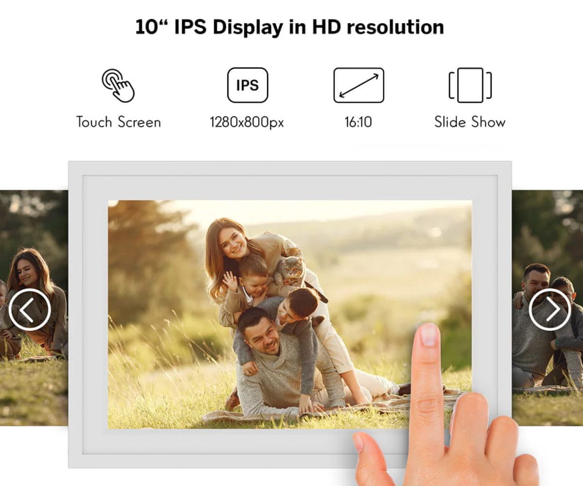 Okvir je opremljen z 10-palčnim IPS HD zaslonom z ločljivostjo 1280 × 800 px, ki zagotavlja ostro sliko, žive barve in široke kote gledanja. Zaslon na dotik omogoča enostavno upravljanje, pregledovanje galerije ter hitro prilagajanje nastavitev.