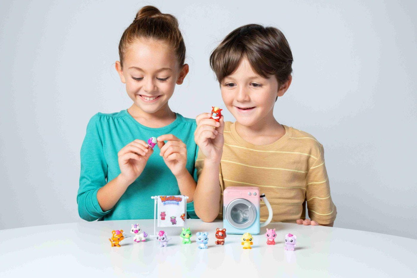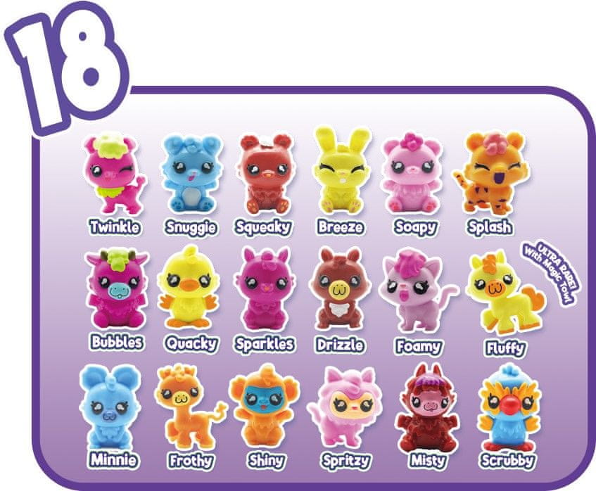 Najdite vrečko z umazanijo. Toda pozor, ne moreš je še videti, saj je tako „umazana“ in čaka, da jo opereš. Odprite vrata pralnega stroja in vanj vstavite to skrivnostno vrečko. Zdaj bo še bolj zabavno! Pralni stroj potrebuje vodo, priložena pa sta tudi posebna „prašek“ in „mehčalec tkanin“. Vse to lepo dodajte v pralni stroj. Vklopite pralni stroj: Zaprite vrata in vklopite pralni stroj. Bilo bo kot pri pravem pranju! Pralni stroj se zavrti in zgodi se čarovnija. Izpustite vodo: Po pranju vodo iz pralnega stroja izpustite s cevjo. Odkrijte žival in brisačo: Zdaj pa sledi najboljši del! Ko se pralni stroj „izprazni“, skrivnostna vrečka izgine, v njej pa se pojavi ljubka živalca Washlings! A to še ni vse! Skupaj z njim se pojavi tudi ljubka majhna brisača. Washingtons: In ker pranje vključuje tudi sušenje, lahko brisačo svojega novega prijatelja Washlingsa obesite na majhno stojalo za sušenje, ki je prav tako priloženo. Tako bo kot prava! S čarobnim pralnim strojem Washlings lahko postanete pravi zbiratelj! Čaka vas kar 18 neverjetnih živali Washlings in vsaka od njih je tako prikupna.