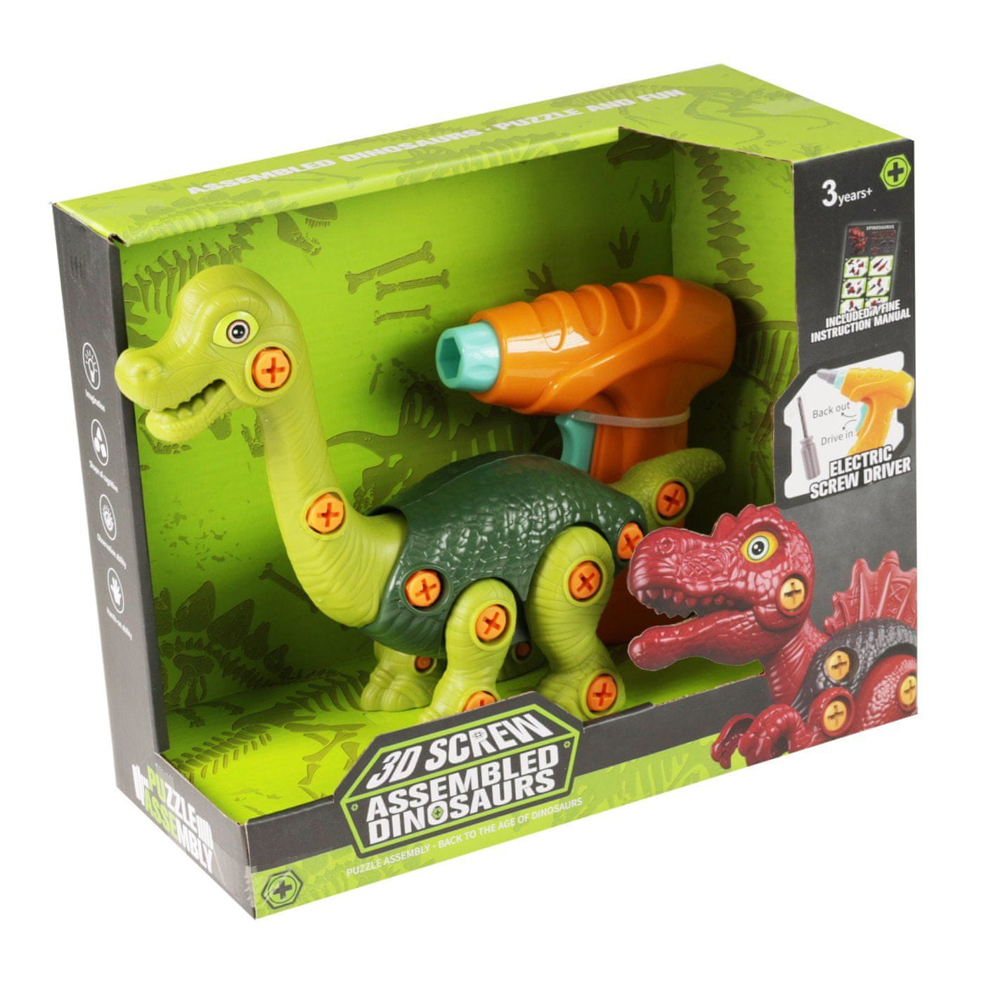 Izvijač dinozaver z izvijačem na baterije. Otroci lahko s pomočjo priloženega izvijača igrivo sestavijo in ponovno sestavijo svojega zelenega dinozavra. Izvijač deluje na 2 × 1,5V AA bateriji, ki nista vključeni. Razvija ustvarjalnost in ročno spretnost.