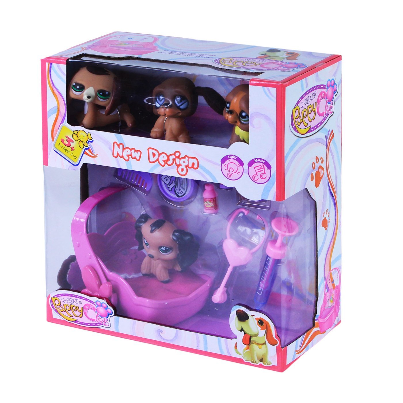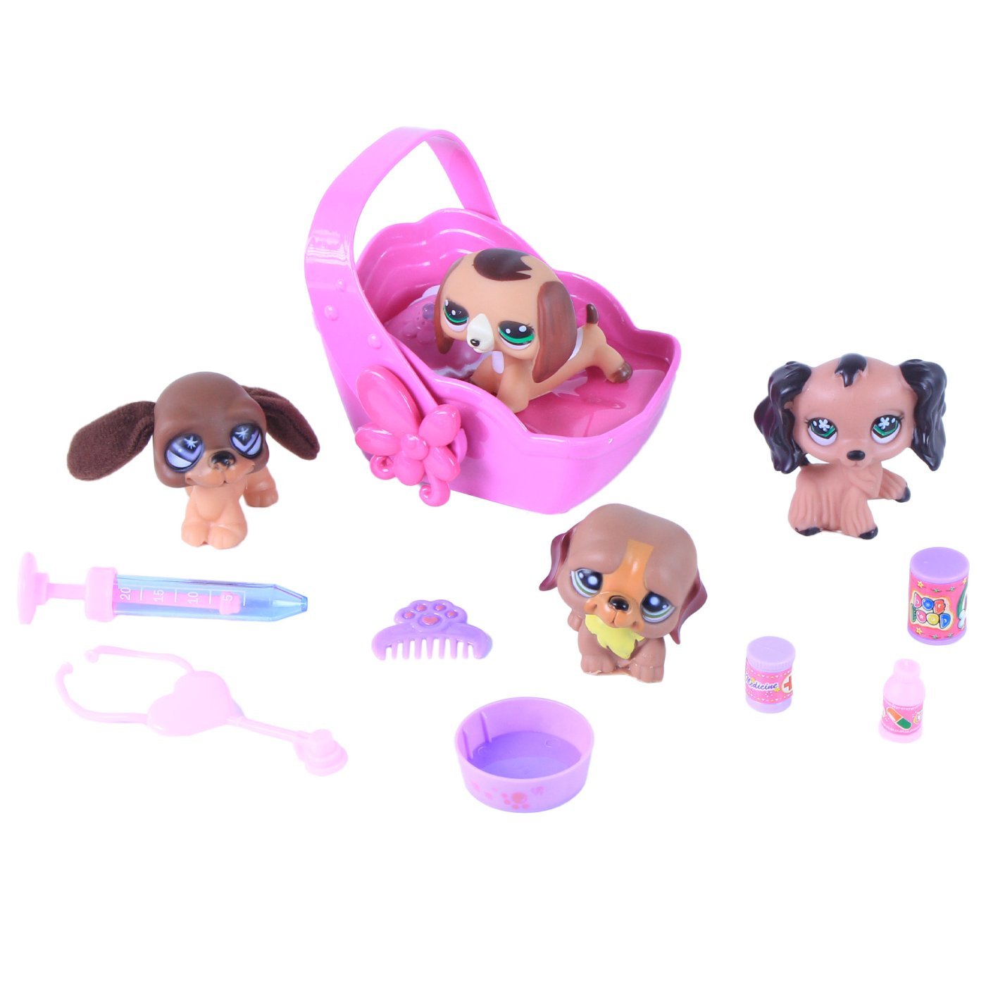 V kompletu so štiri ljubke živali. Živali so visoke približno 5 cm. Paket vključuje nosilec, ki deluje na dve bateriji AA. Nosilec za živali igra in utripa z rdečimi in modrimi lučkami. Lahko služi tudi kot postelja. Paket vsebuje tudi glavnik, posodo za hrano in veterinarske pripomočke, kot so injekcija, zdravila in stetoskop. Baterije niso vključene.