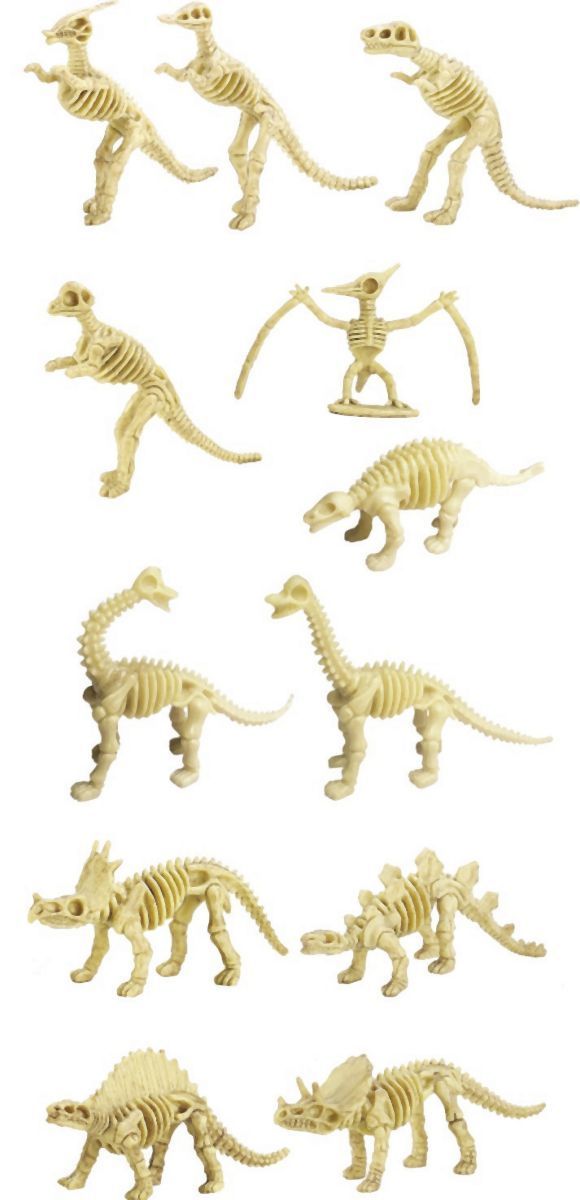 Komplet za kopanje dinozavrovega okostja, 12 različnih vrst. Vključuje orodje in figuro dinozavra. Velikost 6–7 cm. Pakiran v stojalu z 12 kosi.