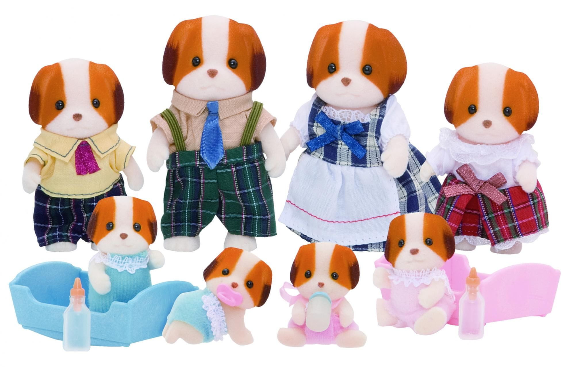 Družina psov. Oče, mama in 2 mladička pasje družine. Otroci si lahko sestavijo svojo zgodbo iz sveta Sylvanian Family. Oblačila na figurah lahko snete in jih spet oblečete. Celoten opis