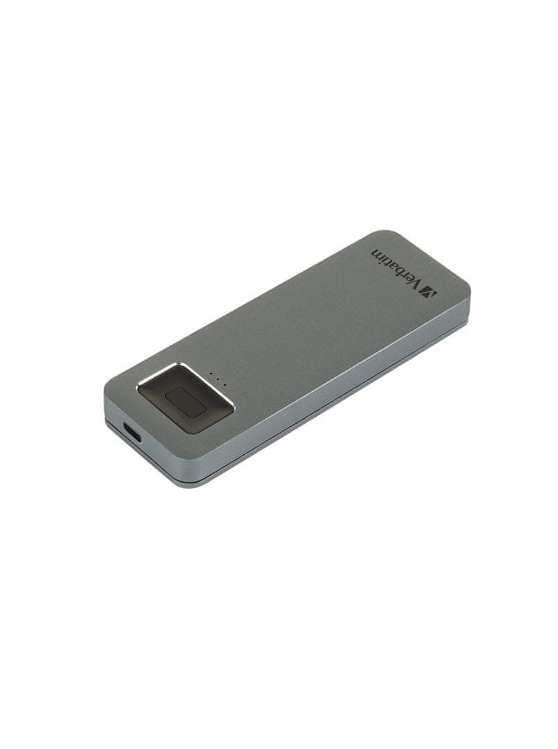 Verbatim Verbatim Exec Fingerprint Secure 512GB SSD, USB Type-C, 256-bit AES šifriranje, aluminijasta in plastična ohišja, združljivo z Windows in Mac OS sistemi, ročno izdelano.