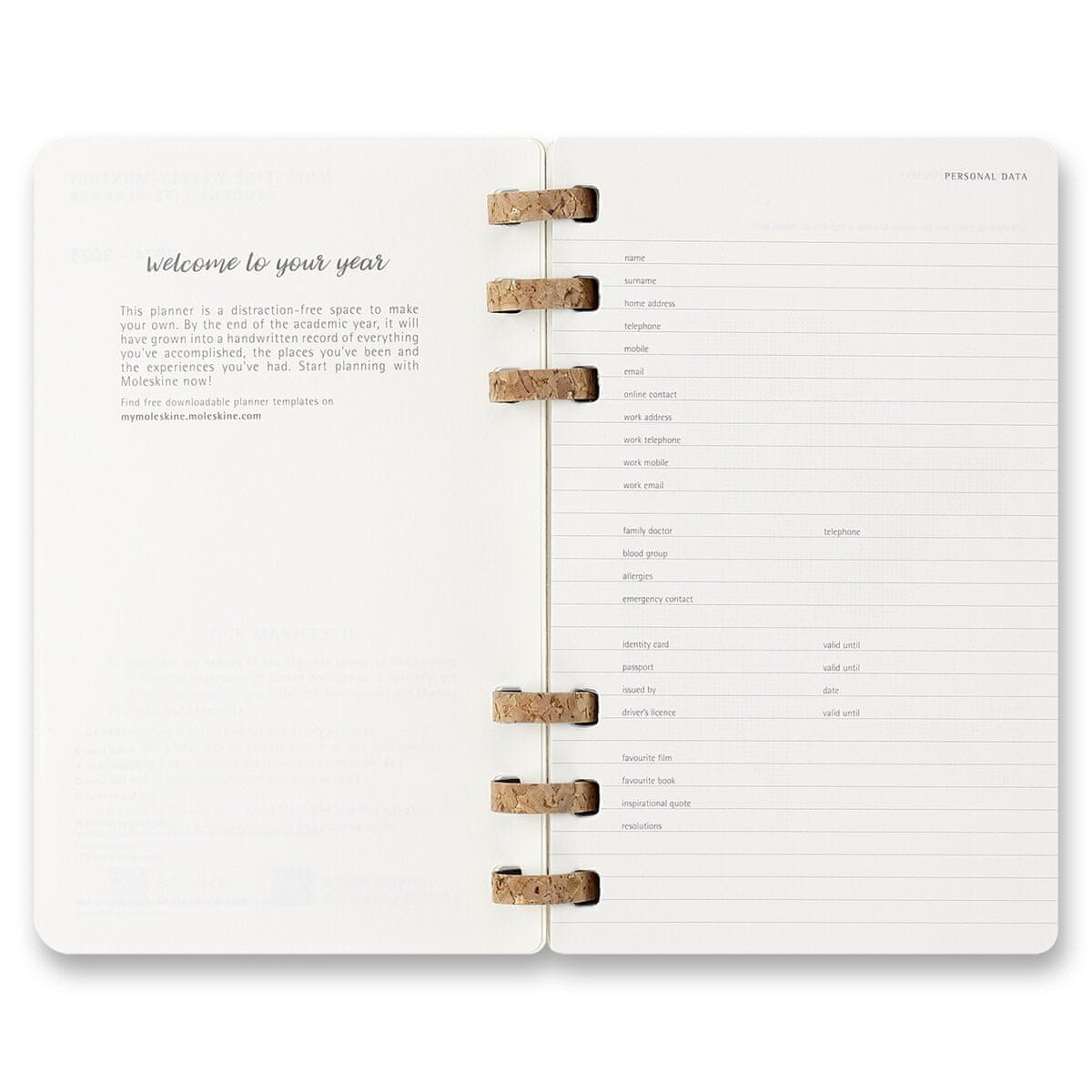 Mere: 13 X 21 CM, 88 LISTOV, Dnevnik je v angleščini., Velikosti mesečnih/tedenskih dnevnikov:, * L – 15 × 21 cm, * XL – 19 × 25 cm (B5), * XXL – 21,59 × 27,94 cm, , Dnevnik vsebuje:, * koledar, * tri zaznamke, * stran z nalepkami, * prostor za vaše ideje in zapiske, * priročen notranji žep za vizitke, , O ZNAMKI MOLESKINE:, Zgodba Moleskine se je začela v 19. stoletju. Zgodovina blagovne znamke Moleskine sega v 19. stoletje v Franciji, ko je bil ustvarjen izdelek z veliko tradicijo. Za zvezke Moleskine so se odločali pomembni umetniki in misleci, kot so Vincent van Gogh, Pablo Picasso in Ernest Hemingway. Danes je blagovna znamka Moleskine sinonim za kulturo, potovanja, ustvarjalnost in osebno identiteto, tako v resničnem kot v digitalnem svetu.
