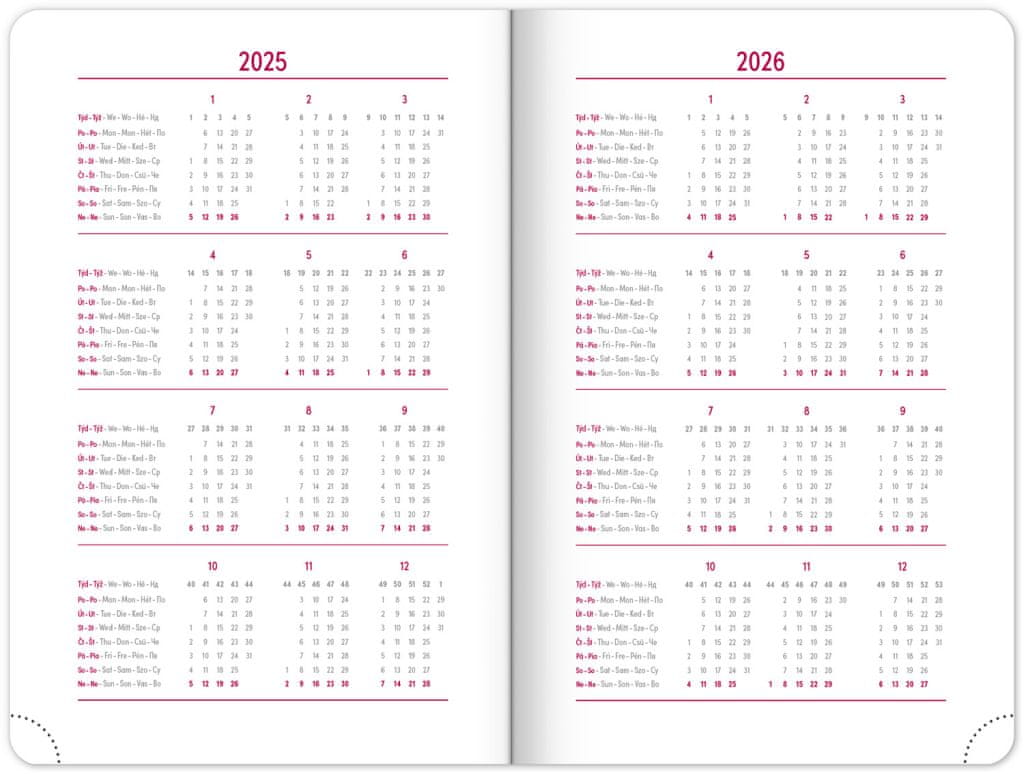 Dnevnik Cambio 2025 s turkiznimi cvetovi. Dnevni urnik s češko-slovaškim koledarjem ter dodatnimi angleškim, nemškim, madžarskim in ruskim koledarjem.