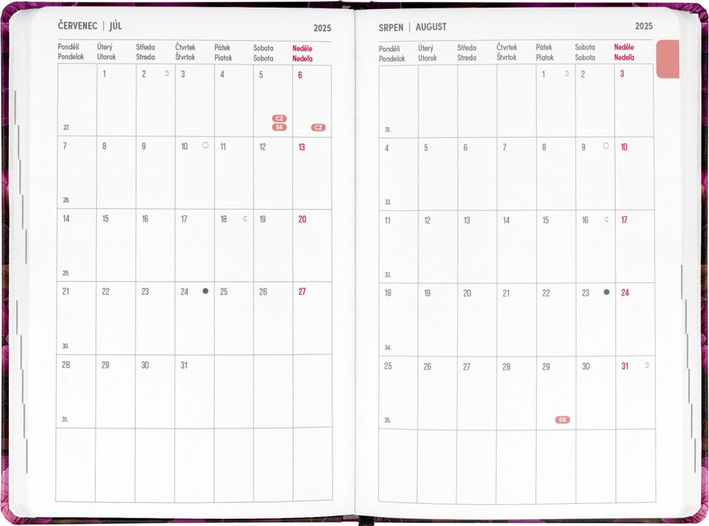 Osemnajstmesečni dnevnik vsebuje pregled za leti 2025 in 2026, seznam čeških in slovaških imen, češko-slovaški tedenski koledar z imeni in prazniki ter prostor za zapiske. Koledar se začne julija 2025 in konča decembra 2026.