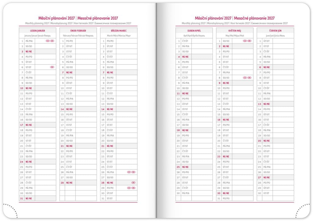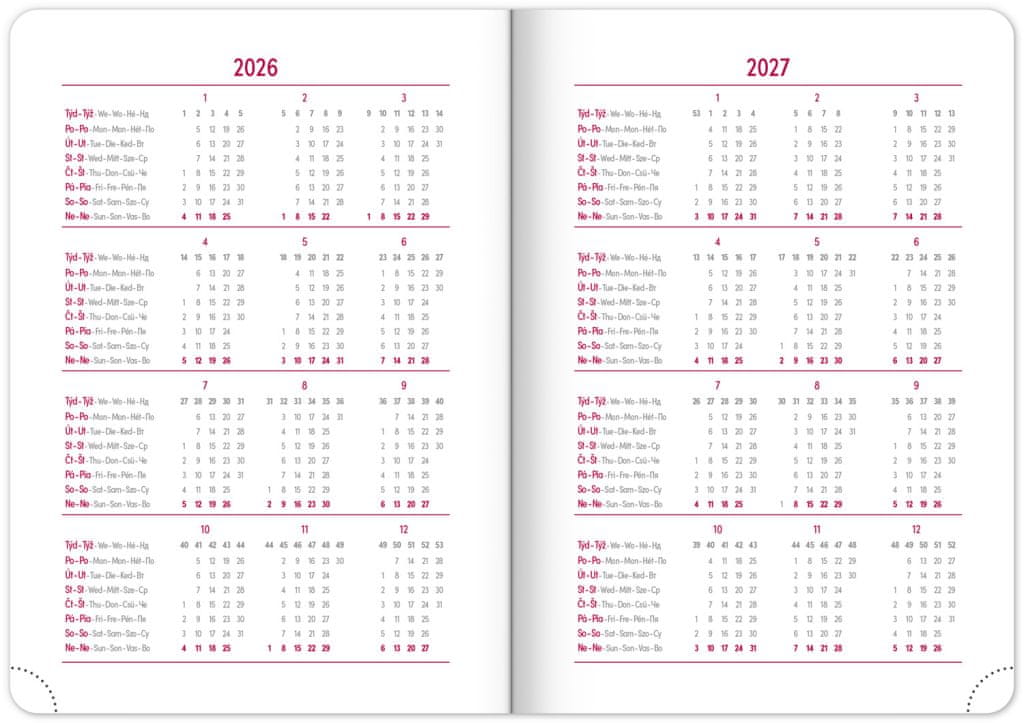 Dnevni planer Ajax 2026 v temno zeleni barvi. Drobno teksturirana površina z netipičnim vtiskovanjem je primerna za vse vrste vtiskovanja. Dnevnik ima zaobljene vogale, zanko za svinčnik in elastični trak. Dnevni razpored s češko-slovaškim koledarjem ter dodatnimi angleškim, nemškim, madžarskim in ruskim koledarjem.
