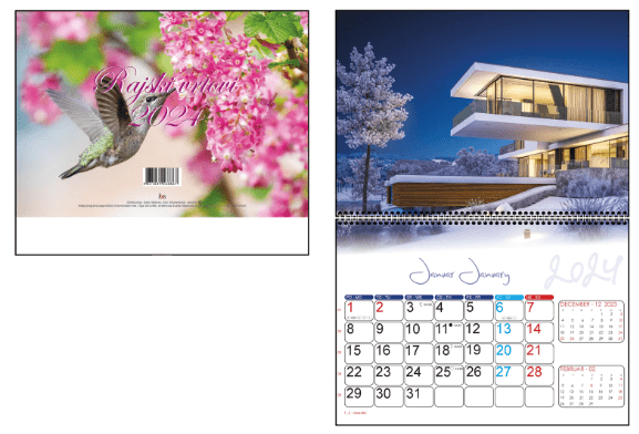 Spiralna vezava na sredini koledarja, označeni prazniki držav SLO, A, I, CRO, H, D, lunine mene