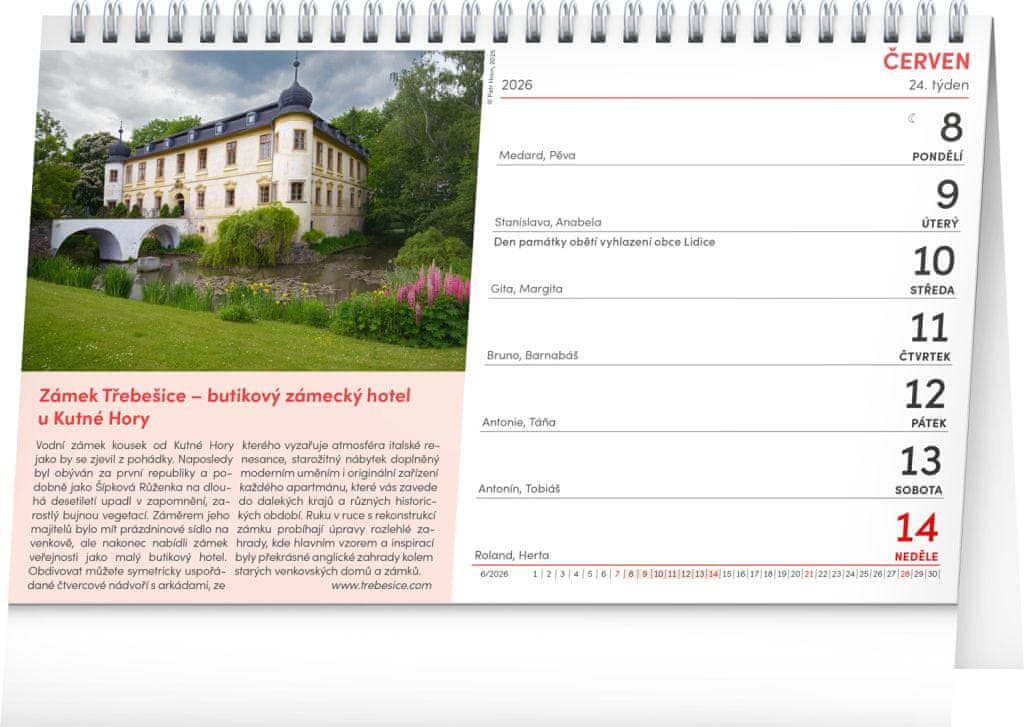 Z namiznim koledarjem z barvnimi fotografijami P. Hrona se odpravite na potovanje po čarobnih gradovih in dvorcih Češke, Moravske in Šlezije. Koledar vključuje tudi češki tedenski koledar s prostorom za vaše zapiske.