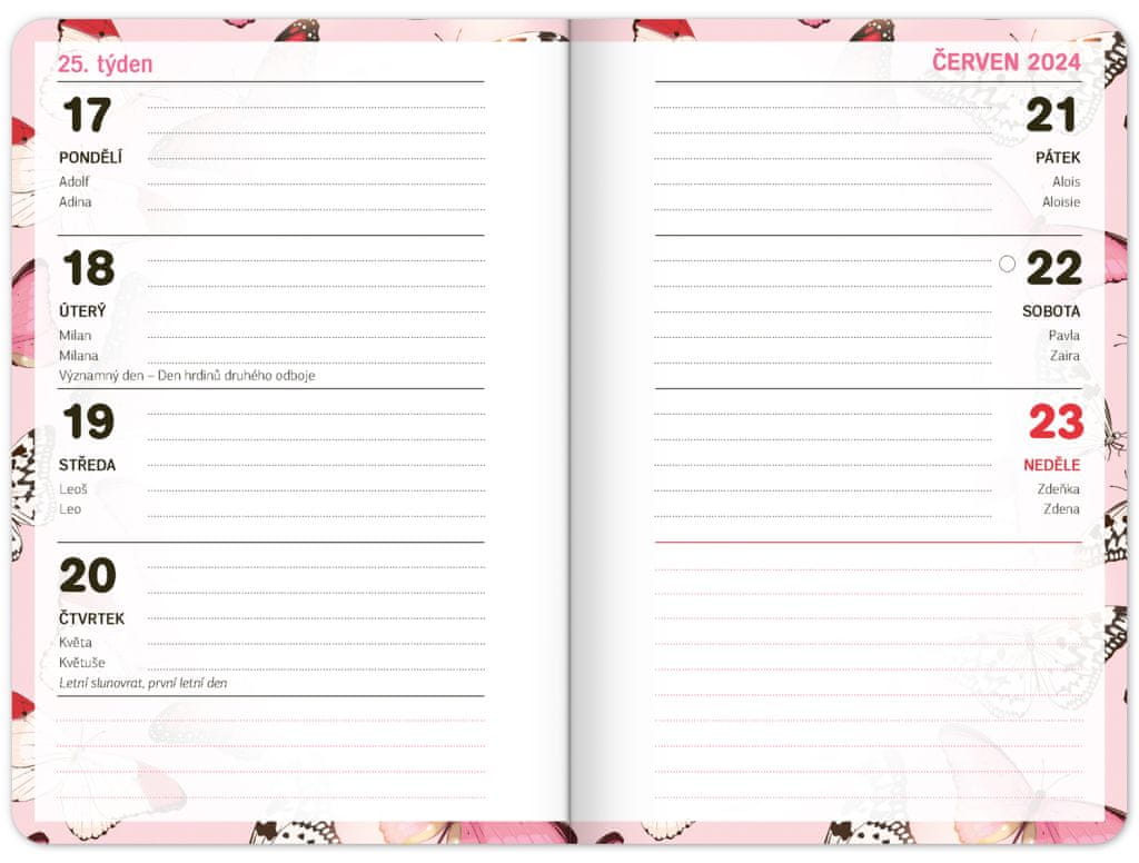 Šolski dnevnik z abstraktnim motivom v roza barvi vsebuje pregled za leti 2023 in 2024, češki tedenski koledar z imeni in prazniki, urnik, prostor za zapiske. Koledar se začne septembra 2023 in konča decembra 2024.