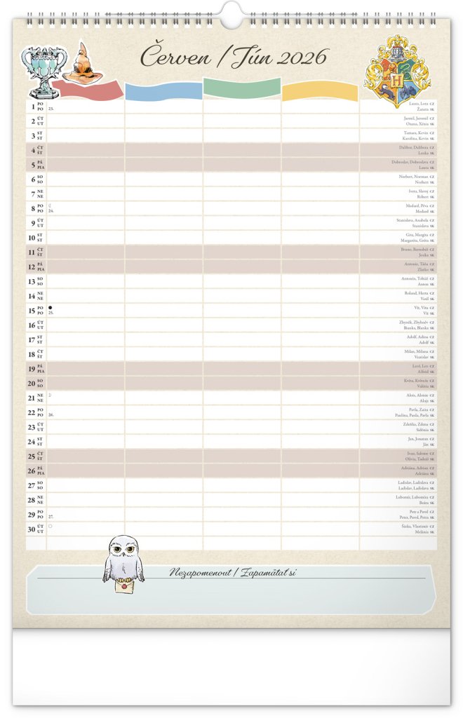 Tudi na Bradavičarki morajo biti stvari urejene! Načrtujte družinske dejavnosti s koledarjem, ki vsak mesec oživi čarobno vzdušje sveta Harryja Potterja. Koledar ima češki in slovaški koledar ter ločen planer za največ štiri člane gospodinjstva, pri čemer ne manjkajo državni prazniki ali mesečne faze. Popoln pripomoček tako za čarovnike kot za Mugle.