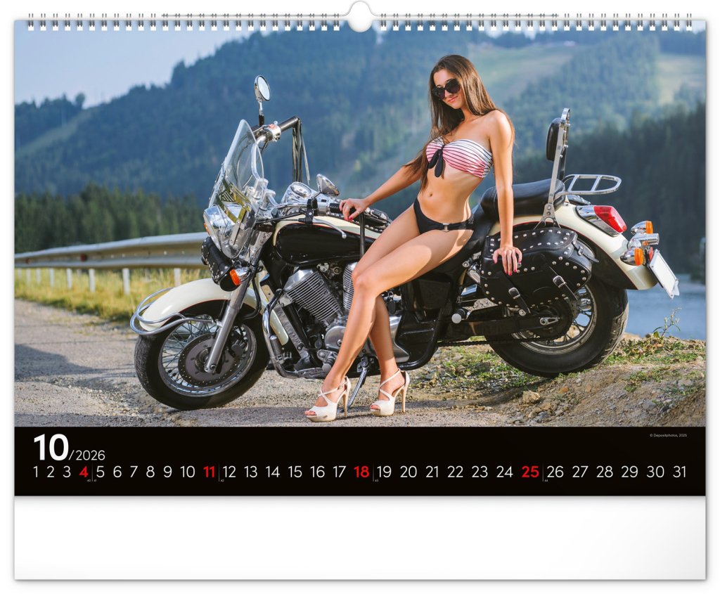 Kalendar za ljubitelje žensk in zmogljivih strojev. Dvanajst čudovitih žensk z bleščečimi motocikli pozira na straneh stenskega koledarja v ležečem formatu. Vključuje vsestranski koledar.
