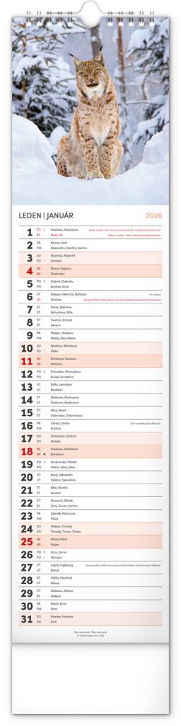Za ljubitelje narave in gozdnih kotičkov – ta podolgovati in praktični koledar vas bo popeljal med srne, lisice in šumeča drevesa. Češko-slovaški stenski koledar vsebuje dvanajst slik živali iz naših gozdov. Je dvojezičen in vsebuje češka in slovaška imena, praznike, spominske dneve in lunine faze. Na vsakem posameznem dnevu je prostor za zapiske.
