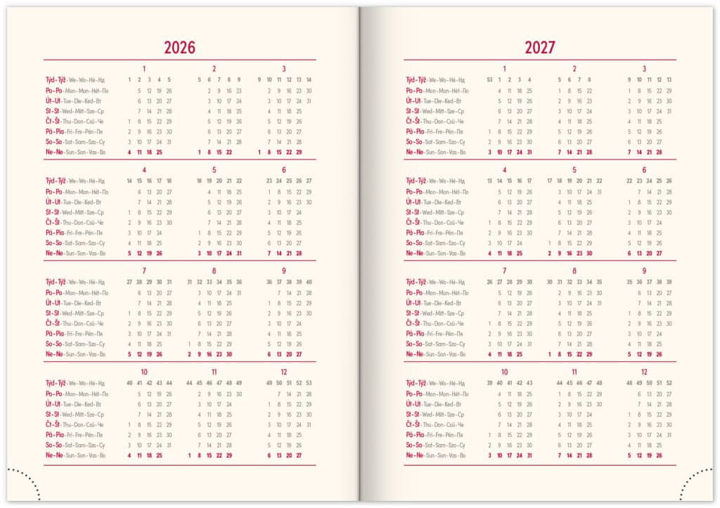 Nova serija dnevnikov sodobne oblike s fiksnim elastičnim trakom in zanko za pisalo. Tedenska postavitev s češko-slovaškim koledarjem ter dodatnimi angleškim, nemškim, madžarskim in ruskim koledarjem.