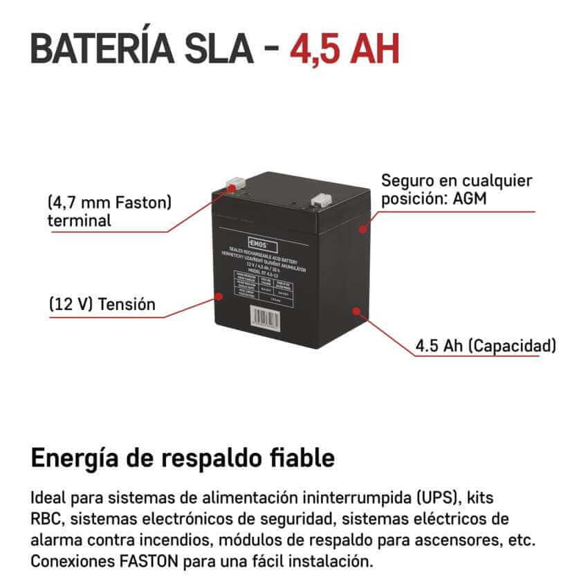 brez vzdrževanja • kemijska sestava: Pb • tehnologija: AGM • napetost: 12 V • kapaciteta: 4,5 Ah • optimalna življenjska doba: 5 let • EZS (elektronski varovalni sistemi) • EPS (elektronski požarni sistemi) • UPS (brezprekinitveni viri) Celoten opis