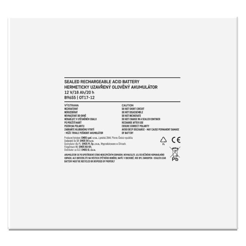 brez vzdrževanja • kemijska sestava: Pb • tehnologija: AGM • napetost: 12 V • kapaciteta: 18 Ah • optimalna življenjska doba: 5 let • EZS (elektronski varovalni sistemi) • EPS (elektronski požarni sistemi) • UPS (brezprekinitveni viri) • zasilna razsvetljava Celoten opis