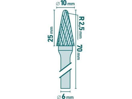 Extol Industrial Rezalnik (8703784) carbide milling cutter, conical rounded (R 2.5mm), dia. 10x25mm/shank 6mm, medium cut (double-cut)