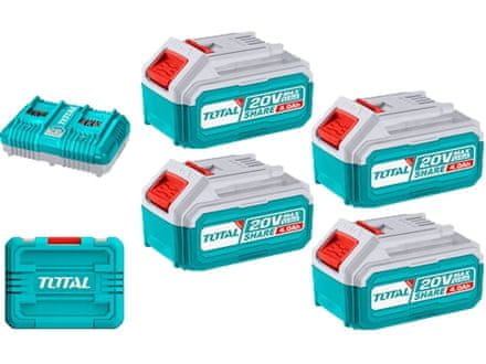 Komplet 4 baterij in 1 hitrega polnilnika Total serije P20S z dvema položajema. Baterije imajo kapaciteto 4000 mAh in so popolnoma združljive z vsemi napravami v kategoriji P20S, tj. vsemi izdelki Total, ki uporabljajo 20V baterije. Hitri polnilnik z dvema položajema polni baterije od 2000 mAh do 7500 mAh. Pakirano v trdem plastičnem ohišju.