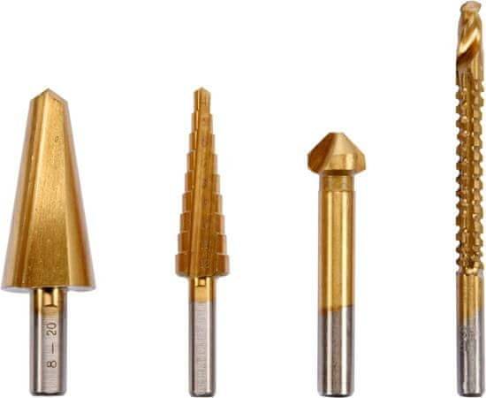 Komplet univerzalnih svedrov za kovino STHOR 22640, izdelanih iz trpežnega in visokohitrostnega jekla HSS. Omogoča natančno vrtanje lukenj v trdo legirano jeklo, aluminij, pločevino in PVC. – Površina, prevlečena z nitridom titana – Stožčasti profil za lažje vrtanje in centriranje – Robovi izvrtin ostanejo čisti in brez ostružkov – Komplet vsebuje: razrezovalnik, poglobitev, stopenjski vrtalnik in rezkar.