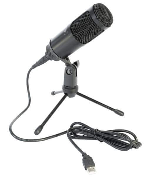 Univerzalni USB mikrofon s stojalom in 1,5 m dolgim (USB A – USB B) kablom. Ima prijeten in uravnotežen zvok in je zasnovan za snemanje zvoka v računalnik, za pretakanje in podcaste. Mikrofon je PnP za MAC in PC (Windows) brez uporabe gonilnikov.