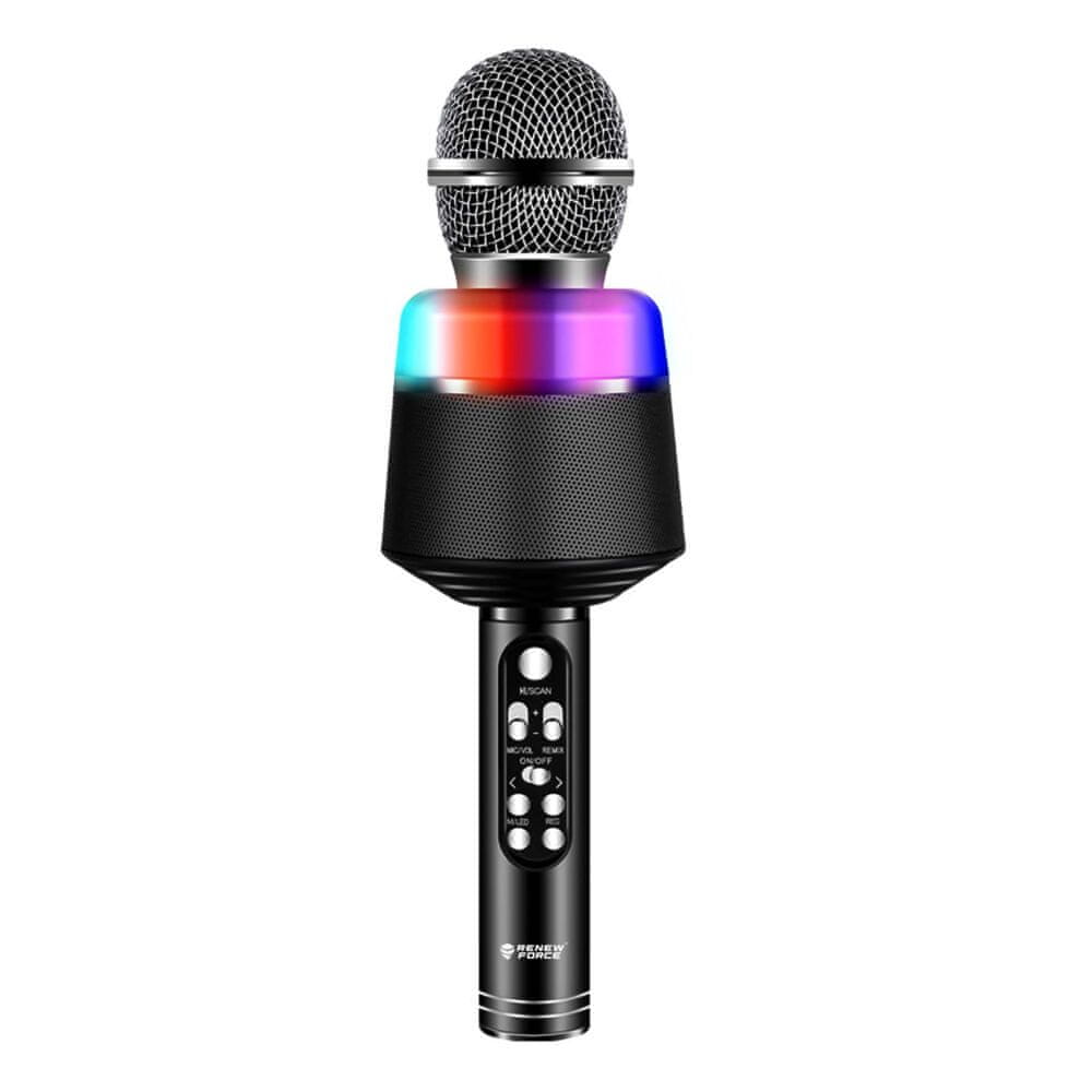 Karaoke mikrofon – brezžični, Bluetooth zvočnik, predvajanje glasbe, snemanje glasu, LED osvetlitev, zmanjšanje šuma, odstranjevanje vokala iz skladbe, nastavitev nizkih in visokih tonov, učinek odmeva, predvajanje s pomnilniške kartice, vhoda jack in USB Celoten opis