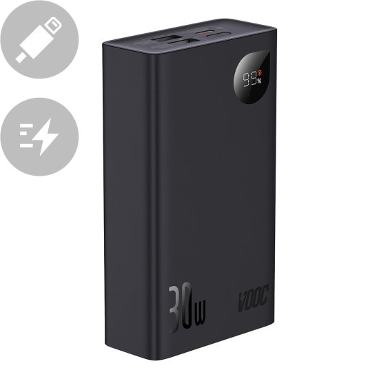 Powerbank 20000 mAh podjetja Baseus podpira največji izhodni tok 30 W. Podpira številne standarde hitrega polnjenja, vključno s SCP, Quick Charge 3.0 in Power Delivery 3.0. Zaradi uradne odobritve podpira tudi standard Oppo Super VOOC. Ima 2 vgrajena izhodna vhoda USB in vhodni/izhodni vhod USB tipa C (za polnjenje telefonov in same powerbanke). Zaslon LED na ohišju prikazuje stopnjo napolnjenosti baterij. IC podpira več varnostnih funkcij za zaščito priključenih naprav pred poškodbami.