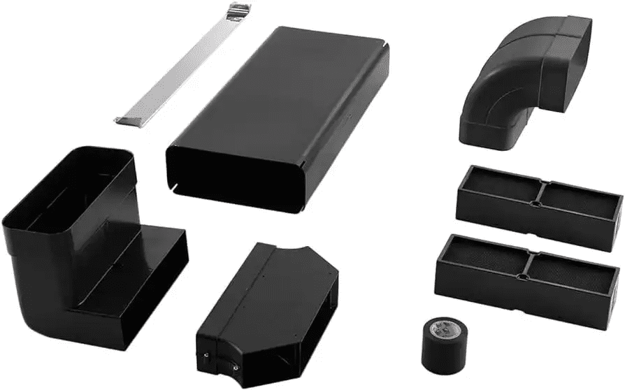 • Set vsebuje: Pravokotni konektor 80 × 94 × 227 mm (za omare globlje od 60 cm), 2× keramični filter, pravokotno koleno 90° – 94 × 227 mm, pravokotna cev 500 × 94 × 227 mm, pravokotna krivulja 90 °, izhodni priključek znotraj podnožja