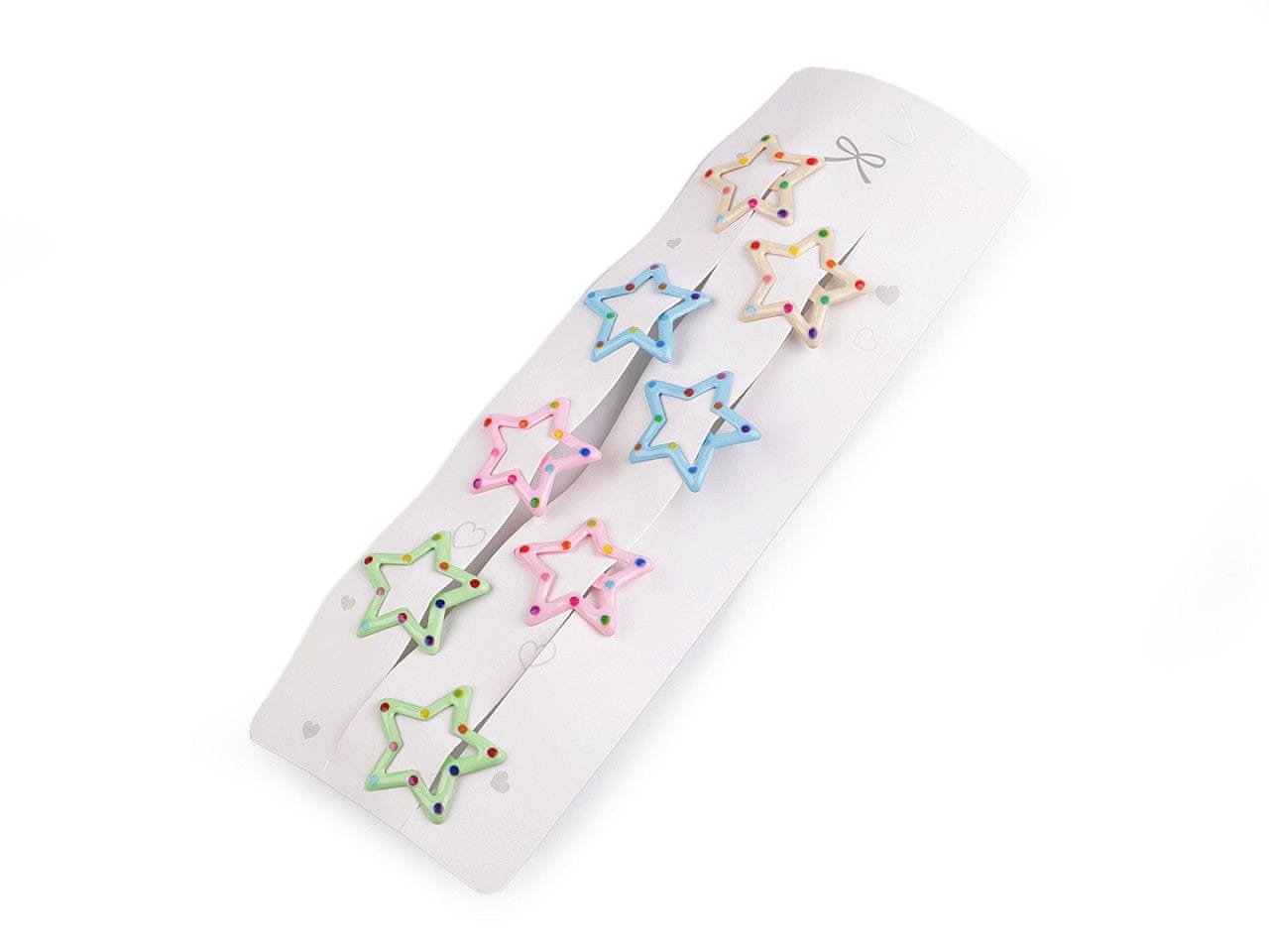 Majhne sponke za lase z zvezdico se prilegajo nežnim otroškim lasem. Držijo tudi tanek pramen las. Izdelane so iz visokokakovostnega materiala, ki dolgo ohranja svojo obliko, funkcionalnost in barve. Na vsaki kartici je 8 kosov po 4 pare sponk za lase. Papirnata kartica ima izrez za obešanje in razstavljanje sponk na stojalu.